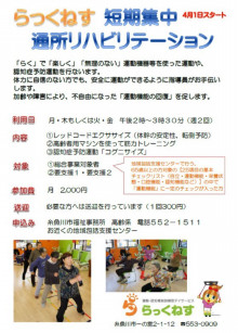 大好評の 「レッドコードエクササイズ」や高齢者用マシンを使って筋力トレーニング、認知症予防運動 「コグニサイズ」 を短期集中に行える 『 らっくねす 短期集中 通所リハビリテーション 』 が4月1日よりスタートしました!