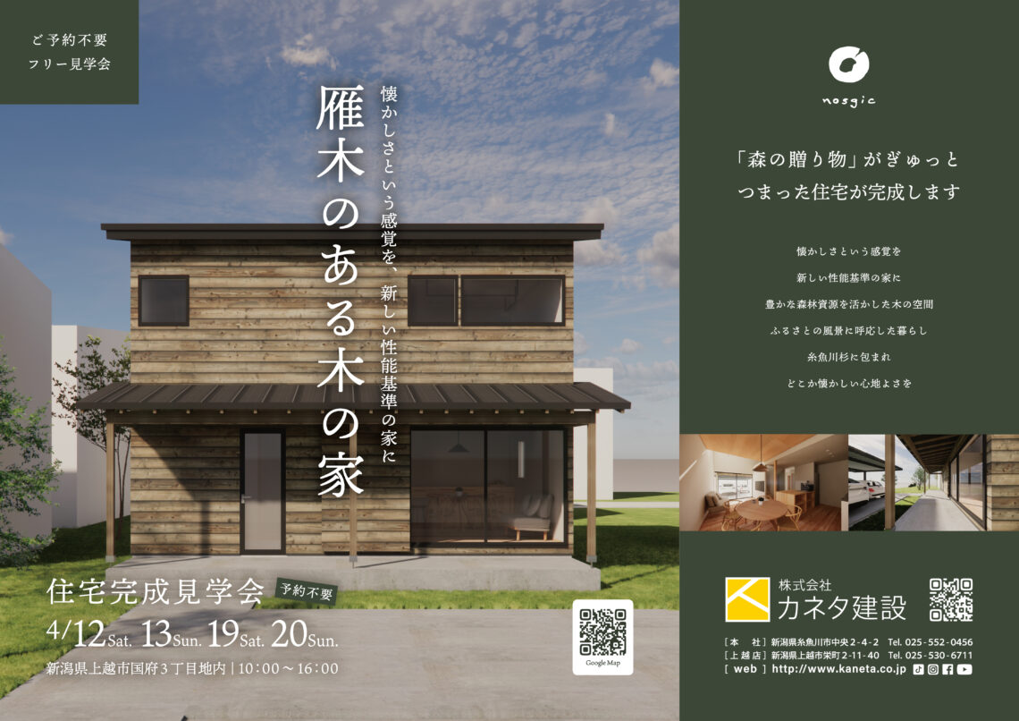お施主様のご厚意により、上越市国府3丁目地内にて「 nosgic 雁木のある木の家 完成見学会 」を開催します。