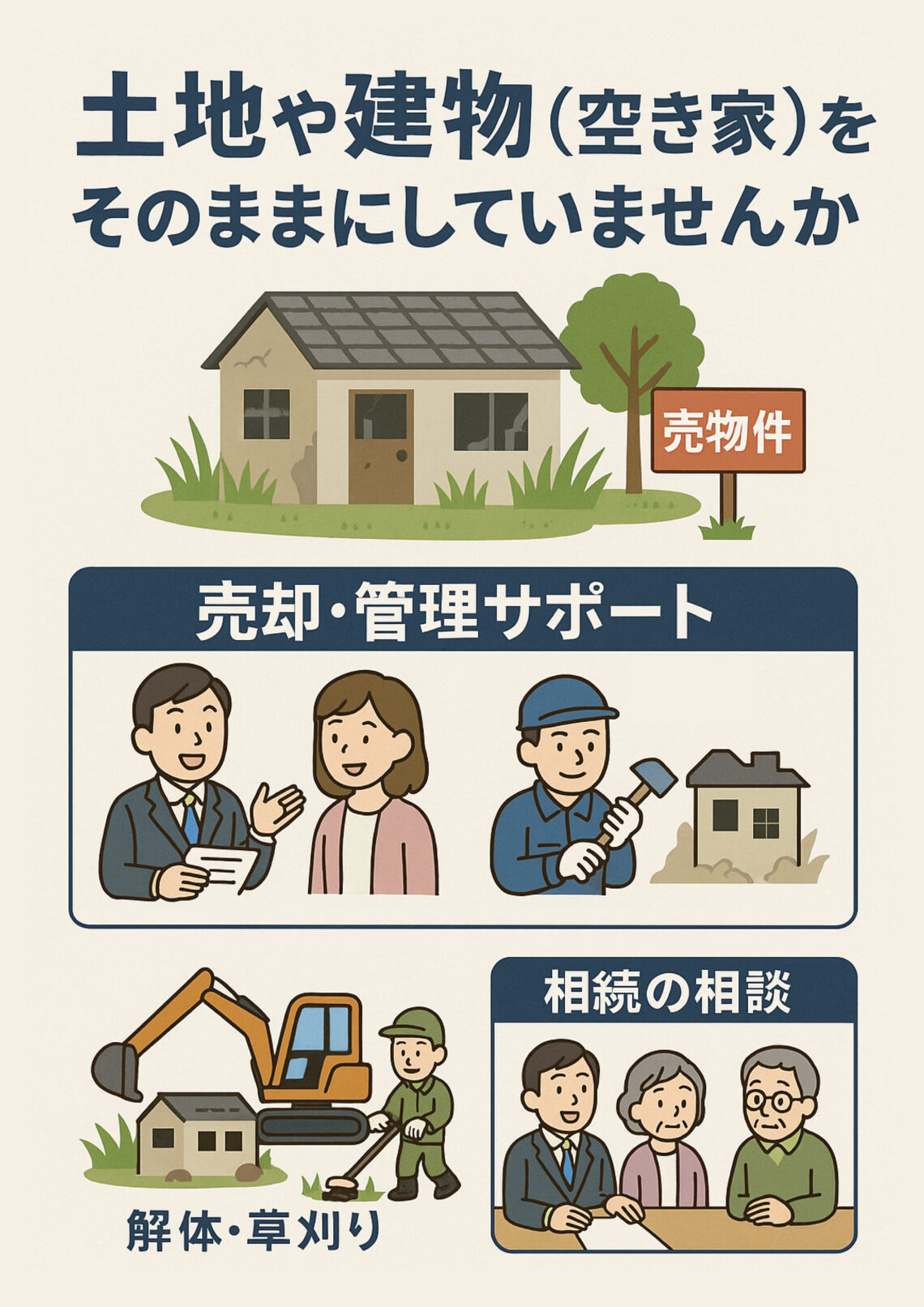 土地や建物(空き家)の査定や物件調査をおこなっています。売却へ向けた準備や税金面等のアドバイスで、適切な時期に売却できるように進めてまいります。