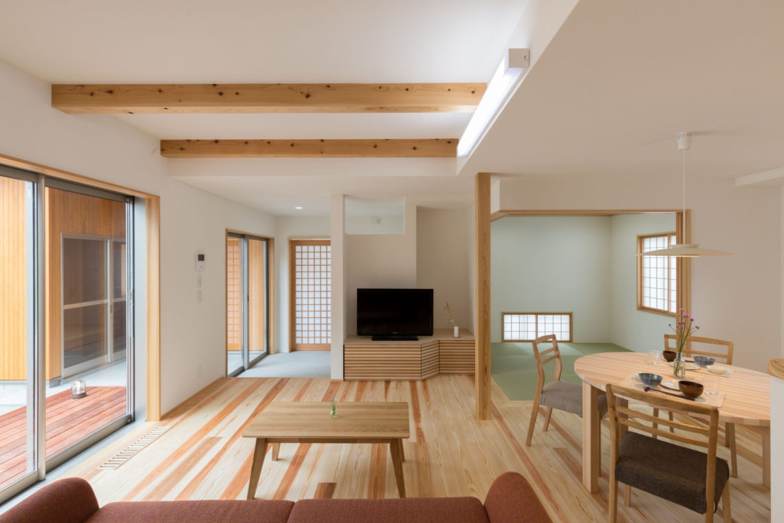 耐久性とメンテナンス性の両立を図ったガルバリウム鋼板製のオフブラックの外壁に、地元糸魚川産のキノイエオリジナル・カットの杉板の組み合わせが美しい外観デザイン。中に足を踏み入れると圧密処理された無節の無垢杉フロアがひときわ目を引く明るい空間。ソトとナカをつなぐ土間~ゲヤ~離れの空間が、建物の延べ床面積以上に広さと使い勝手を実現しています。まさに、小さくつくって大きく暮らす。キノイエの魅力を最大限具現化した住まいです。
